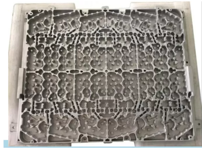 ダイカスト粗胚製品の肉厚は 2.8mm で、充填長は 340mm です。キャビティ内部の多数のピラーは連結や支持がない状態です。