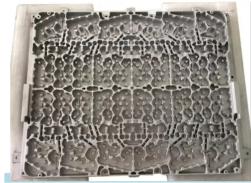 The wall thickness of die casting rough embryo products is 2.8mm and the filling length is 340mm. Many pillars inside the cavity are without connection and support.